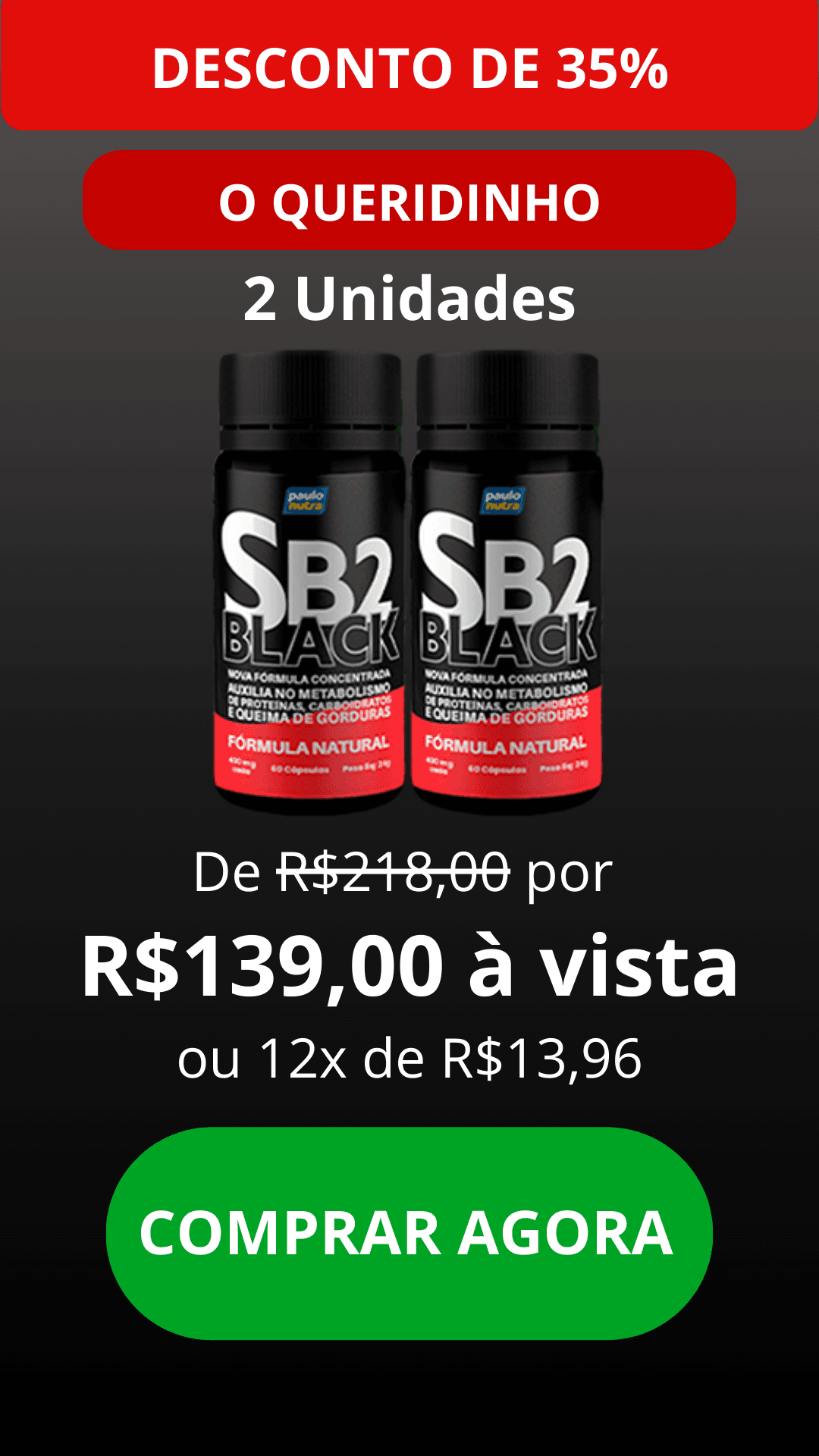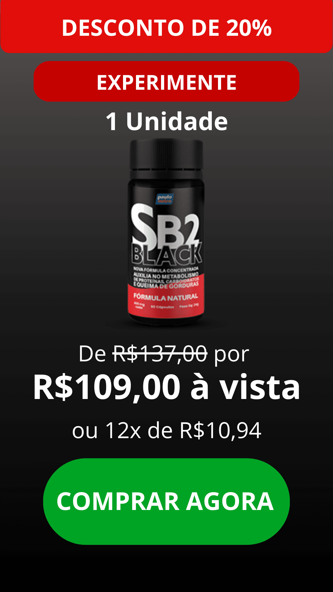 Está cansado de tentar emagrecer sem sucesso? O SB2 Black é a solução que você esperava. Com uma fórmula avançada em cápsulas, enriquecida com poderosos ativos naturais, desenvolvida para ajudar qualquer pessoa a alcançar um emagrecimento saudável, nosso suplemento oferece resultados rápidos e seguros.